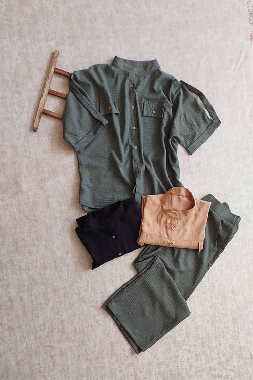 دکمه چوبی و دوخت تمیز و عالی ، پارچه باکیفیت، پشت شلوار کش ۳ سانتی و فاق شلوار بلند و راحت