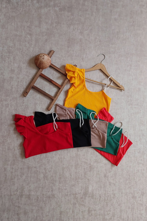 یه طرف نیم آستین پیل افتاده و یک طرف بند مرواریدی قابل جدا شدن و مدل رومی میشه